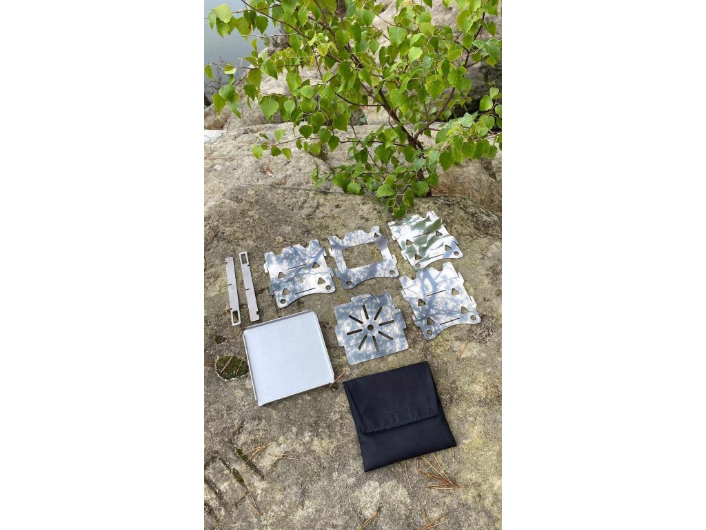 Samotný dřívkový vařič se skládá z 8 dílů, které jsou uloženy v na míru šitém pouzdře. Výhodou je i podložka, která brání propadnutí žhavých uhlíků pod dřívkáč. Složení dřívkáče Vám nezabere déle než 2 minuty a vzhledem k jeho hmotnosti Vám nepřidá na váze. Proto je vyhledávaným doplňkem na cesty jak začátečníků, tak profesionálů.