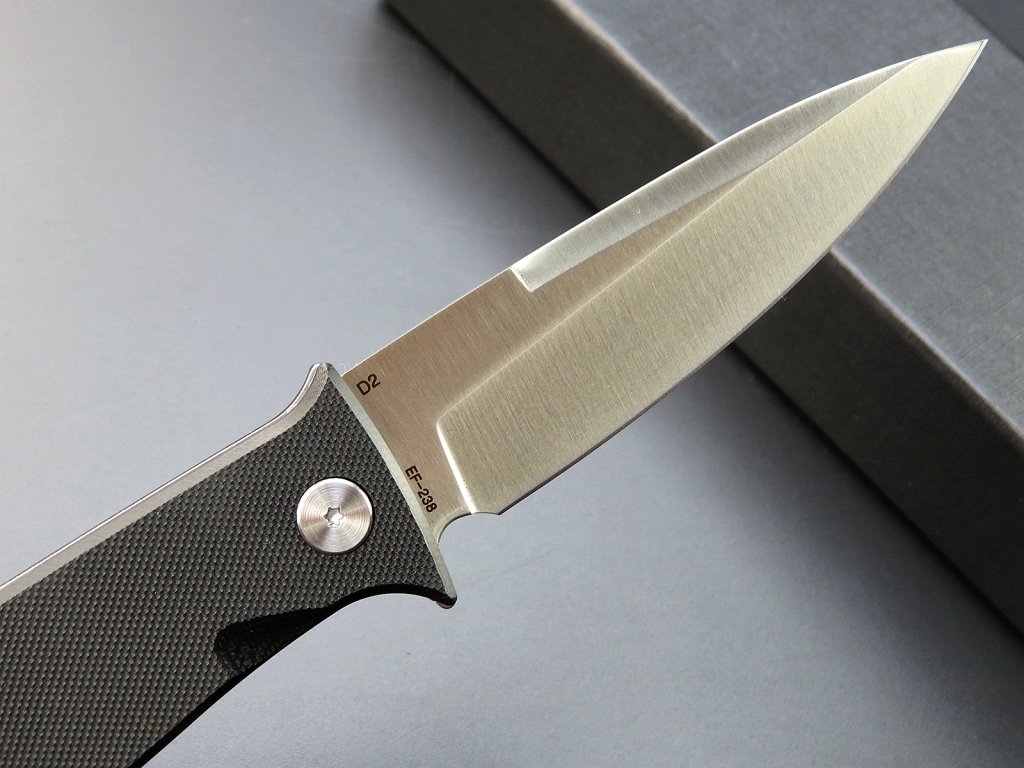 Spolehlivá čepel ze zápustkové oceli D2, potažená černým olejovým filmem, který je odolný vůči korozi. Ocel D2 má vysoký obsah uhlíku a chromu a díky tomu se vyznačuje vysokou odolností k opotřebení a korozní odolností. Poskytuje ostrost jako břitva, pro maximální přesnost řezání, se silnou houževnatostí a vynikajícím zachováním ostří. Údržba: U oceli se doporučuje pravidelné čištění, převážně po použití, aby se zabránilo možnosti korozi. Při styku se slanou vodou, ovocnými kyselinami nebo potem očisti co nejdřív. Ocel by se měla pravidelně potřít olejem.