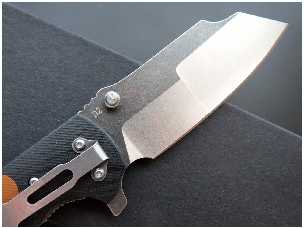 Ocel D2 je vysoce uhlíková, vysoce chromová zápustková ocel (tzv. polonerezová) s vynikající odolností proti opotřebení a dlouhou trvanlivostí ostří. Tvrdostí se pohybuje 58-61 HRC. Údržba: U oceli se doporučuje pravidelné čištění, převážně po použití, aby se zabránilo možnosti korozi. Při styku se slanou vodou, ovocnými kyselinami nebo potem očisti co nejdřív. Ocel by se měla pravidelně potřít olejem.