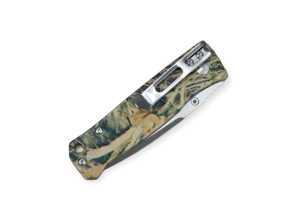 Rukojeti jsou vyrobeny z G10. Tento materiál má vysokou pevnost, odolnost proti nárazu a je odolný vůči změnám vlhkosti a teploty. A díky strukturovanému povrchu a ergonomickému tvaru rukojeti nůž neklouže v rukou. Nůž M018 má rukojeť v camuflage stylu, který zaujme okem a spline s přírodou.