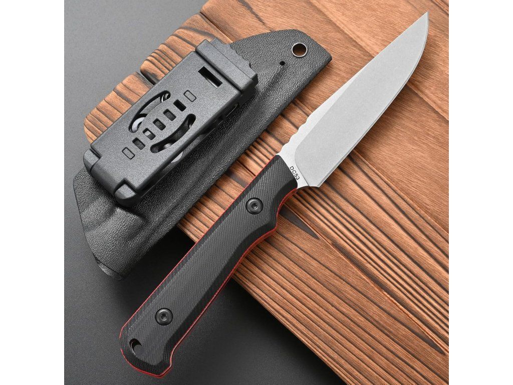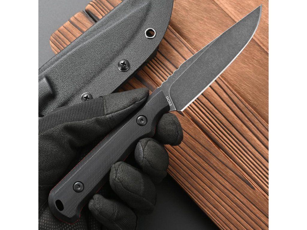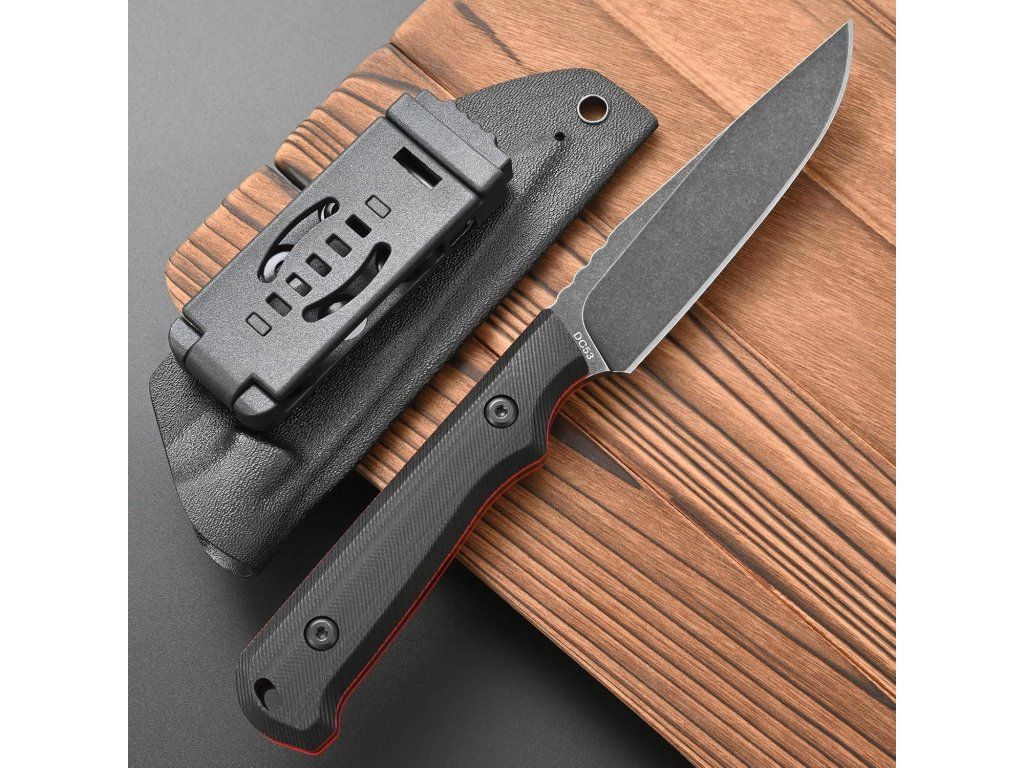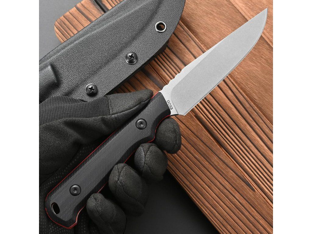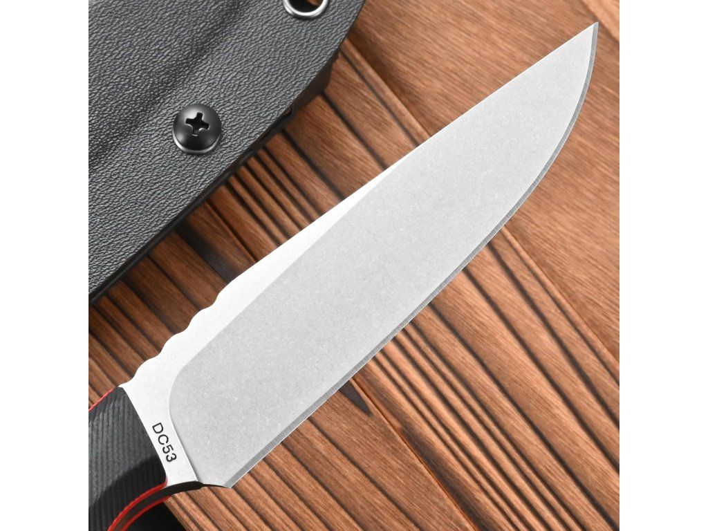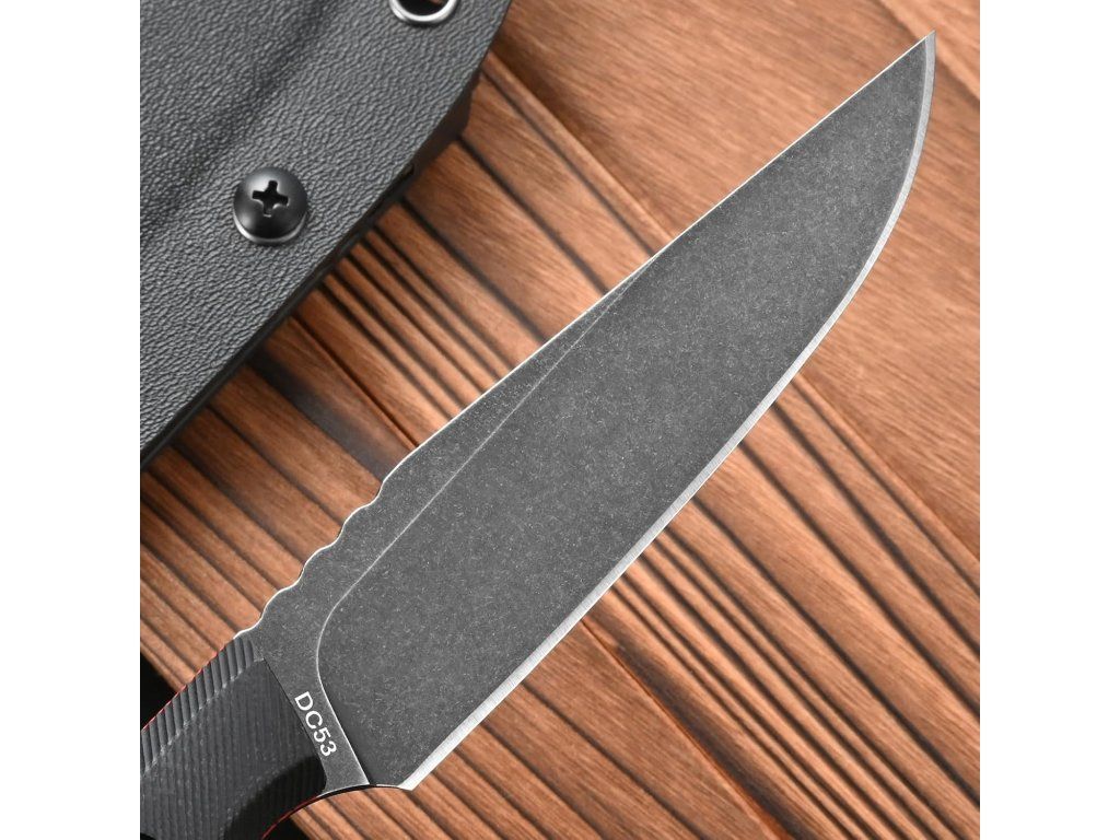 Ocel DC53, tvrdost 60-62HRC, tato prémiová ocel lépe drží ostří a je tvrdší než mnoho jiných ocelí, jako je D2, 14c. používá proces mytí černého kamene, který je odolný proti poškrábání, povrchová úprava a broušení je pěkně čisté a rovnoměrné. Ocelová čepel DC53 je ocel D2 na steroidech.