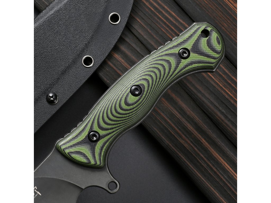 Rukojeť nože je vyrobena z vysoce odolného materiálu G10, který je známý svou lehkostí, odolností a protišmykovými vlastnostmi. Ergonomický design rukojeti zajišťuje pohodlný a pevný úchop, což je zvláště důležité při práci s mokrými rukama nebo v těžkých podmínkách. Rukojeť je navržena tak, aby minimalizovala únavu ruky a zajišťovala vysokou kontrolu nad nožem během dlouhodobého používání. S tímto nožem budete mít maximální jistotu při každém řezu nebo práci.