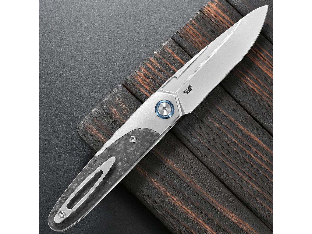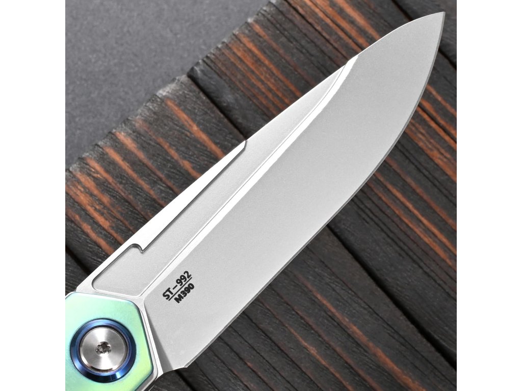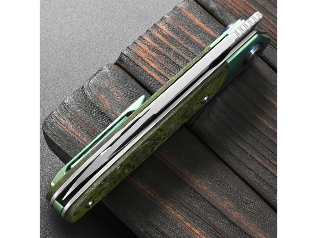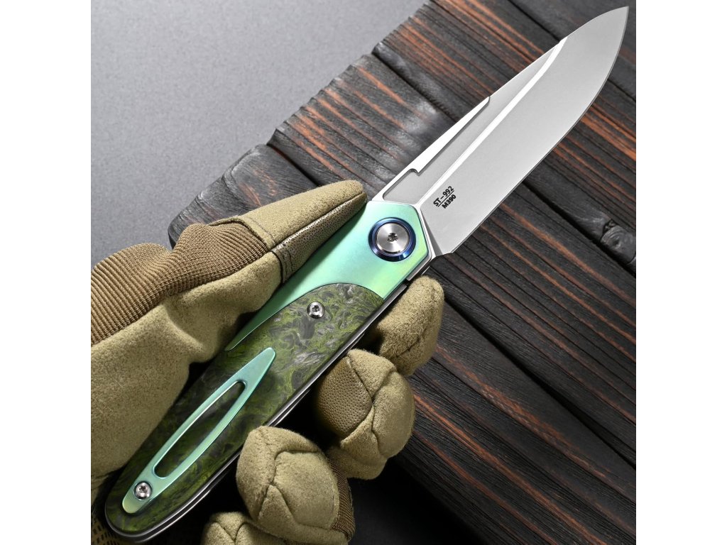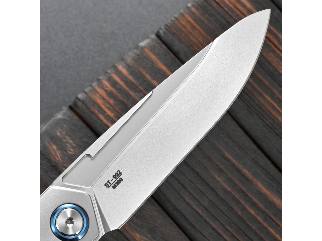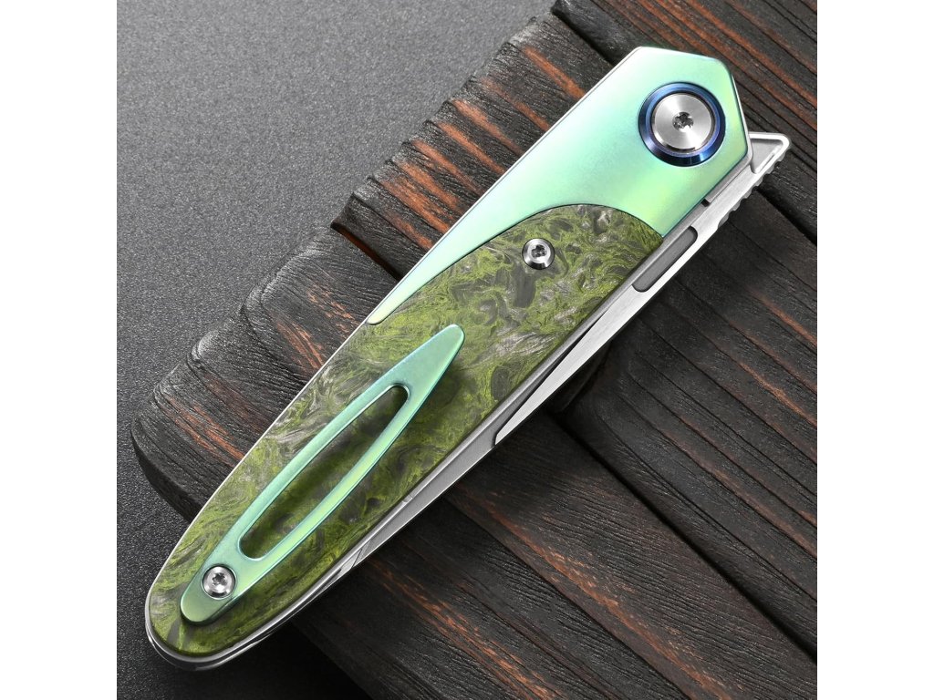 Už na první pohled zaujme propracovaná titanová rukojeť s jemným perleťovým efektem. Nejde ale jen o design. Titan přináší ideální kombinaci nízké hmotnosti, vysoké pevnosti a odolnosti vůči korozi, takže nůž zvládne každodenní nošení bez známek únavy materiálu. V ruce působí pevně a vyváženě, ale zároveň nepůsobí těžkopádně.