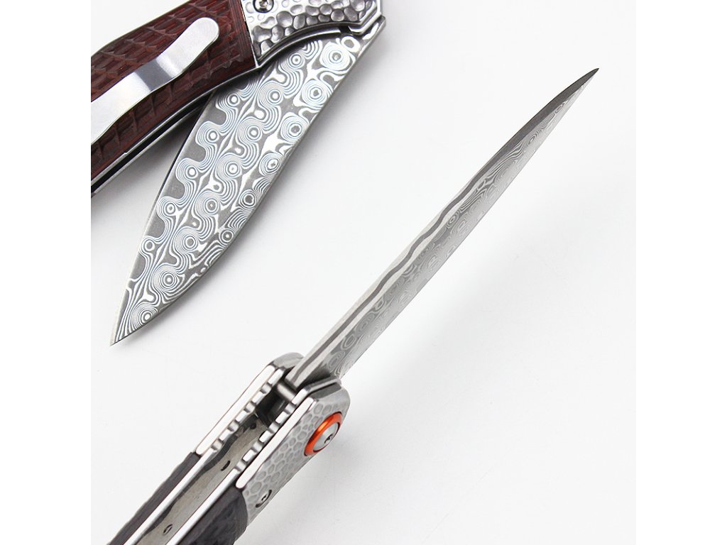 Design rukojeti doplňuje vzhled damaškové čepele a vytváří stylový kapesní nůž vhodný nejen pro praktické použití, ale i jako sběratelský nebo dárkový předmět.